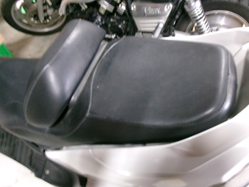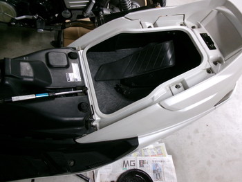 走行中に突然エンジンがストップしてスタートボタンを押しても始動しない状態で入庫してきました。セルモーターの回転も弱いのでまずバッテリーから点検します。バッテリーは右ステップの下にあります。
